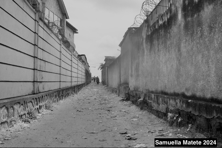 En prenant cette rue en photo, j’ai ressenti une nostalgie en pensant aux rues vides de la Pologne dans le ghetto de Varsovie, où les juifs se faisaient harceler, très souvent tués par des Allemands, voilà pourquoi je l’ai mis en filtre noir, pour me rappeler des désastres inhumains causés par les puissants belliqueux de ce temps-là. Cette rue se trouve dans la commune de Mont-Ngafula. © Samuella MATETE
