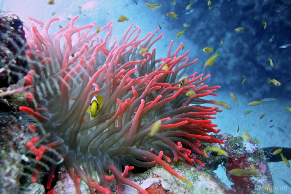 A clownfish peeks out from its vibrant red anemone home in the waters of Marsa Alam, Egypt. © Clelia Watt