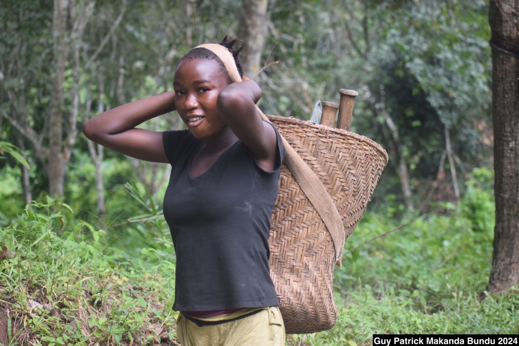 Une jeune femme avec son panier contenant des outils aratoires se préparant d’aller au champ. Photo prise au village Kimbenza dans le Mayombe, Kongo Central. © Guy Patrick Makanda Bundu