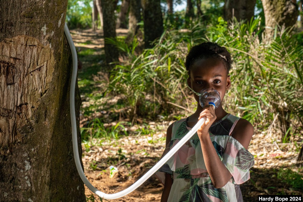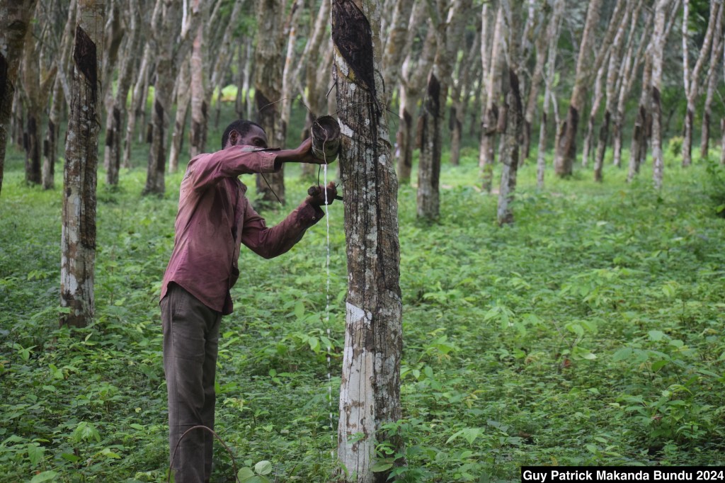 Un métayer de la société SCAM dans la plantation d’hévéas en train de faire de saignées et de récolter la fève d’hévéa. Photo prise dans la plantation d’hévéa de la société SCAM au village Kimbenza dans le Mayombe. © Guy Patrick Makanda Bundu