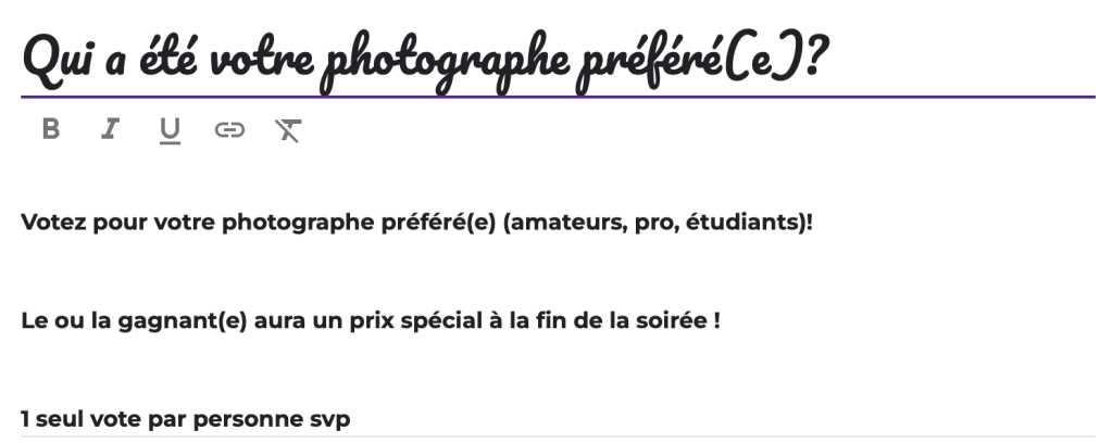 A la fin de ce blog post, vous pouvez voter pour votre photographe préféré via le formulaire Google .