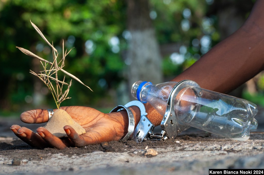 Le plastique qui emprisonne la bonne croissance et culture de la terre, sous le ciel chaleureux de l’après-midi de Kinshasa pour montrer comment le plastique détruit la terre avec sa pollution (une bouteille plastique, menotte, une main pour symboliser la culture lun). © NSOKI KIPELA KAREN