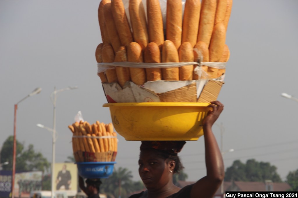 Une maman de Kinshasa portant une bassine remplie de pain à vendre au marché. © Guy Pascal ONGA’NTSANG