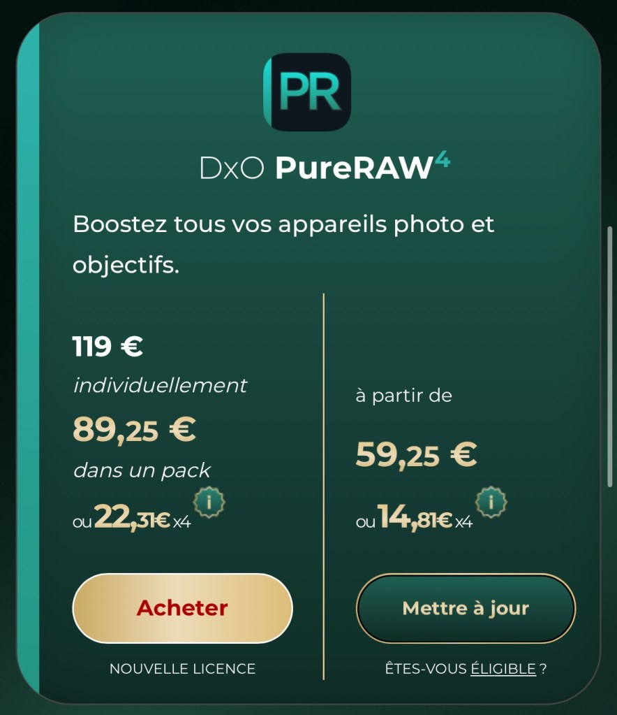 DxO PureRAW : Un plugin révolutionnaire qui apprête vos fichiers RAW à la perfection avec une technologie exceptionnelle de débruisage et de correction. Compatible avec Lightroom, Capture One, et plus encore.